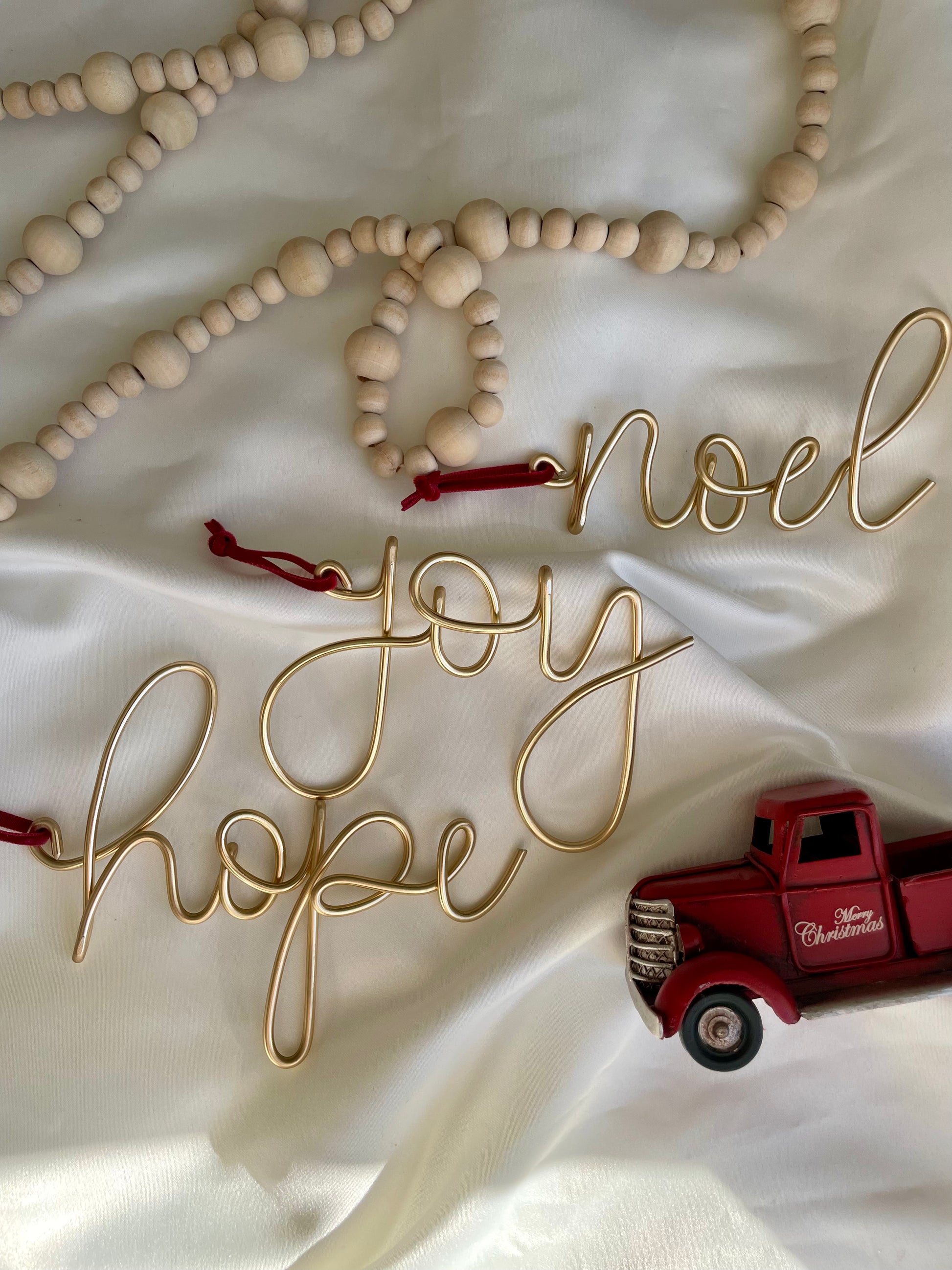 Each decoration is handmade from thick 3mm wire, finished with a velvet ribbon. Joy measures at 12cm long.